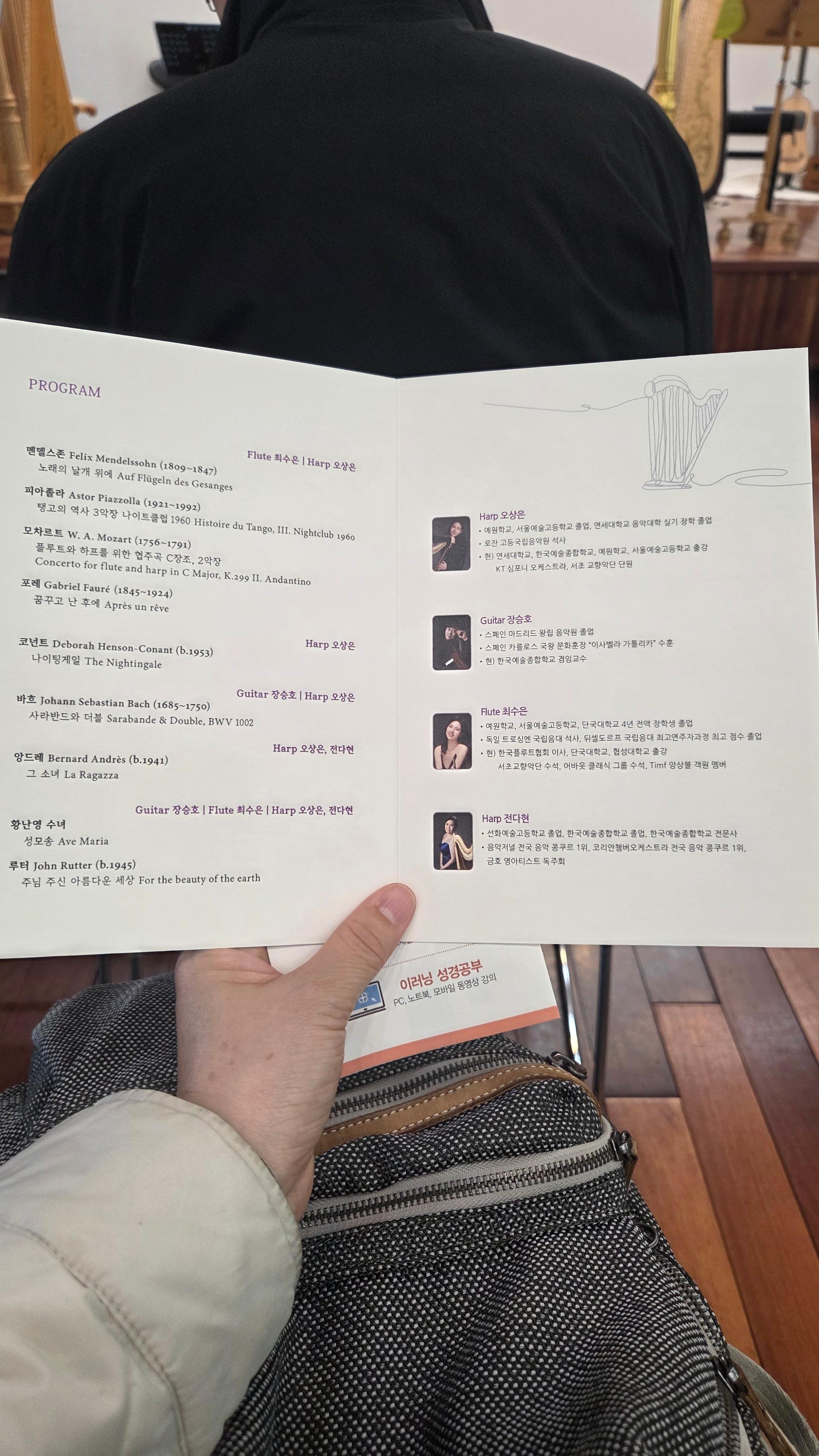 연주 전에는 간단한 인문학적 해설이 곁들여져, 왜 하프가 “치유의 악기”로 불리는지, 그리고 각각의 곡이 지닌 이야기와 감정적 결이 무엇인지에 대해 청중과 소통하는 시간이 있었습니다. 이는 단순한 연주회가 아니라, 음악을 통해 마음을 돌아보고 위로를 얻는 여정으로 기획된 것이 분명했습니다.