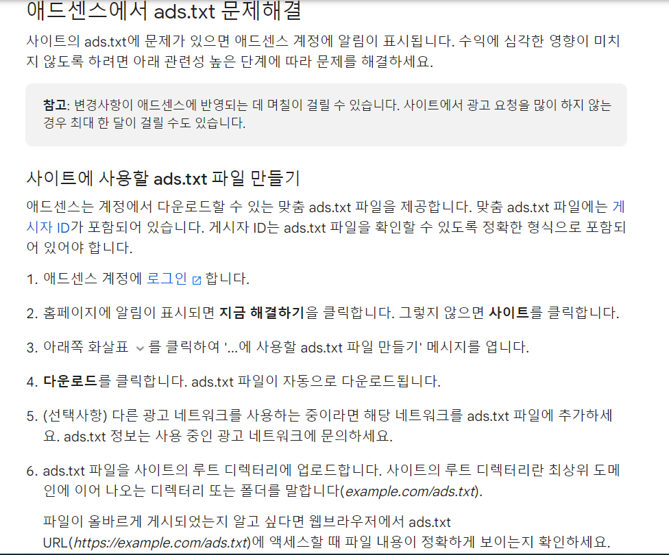 승인 후 광고 자동연결 이후에도 광고가 뜨지 않아 검색해 보니 구글 애드센스 화면에 이런 문구가 보였습니다. 아 이건 또 뭡니까 ads.txt는 뭘까요? 블로그에 광고를 내기 위해서는 일정 기준을 통과해야 합니다. 그런데 이렇게 기준을 통과했다 하더라도 광고주가 제대로 된 블로그에 광고를 실을 수 있도록 권한을 주기 위한 작업을 하기 위해 ads.txt 파일을 업로드해야 한다고 합니다. 여기서 제대로 된 블로그는 멋진 블로그, 파워 블로그 개념이 아니라고 합니다. 비정상적이거나 광고주와 관련이 없는 블로그에는 광고가 실리지 않게 함으로써 광고비가 터무니없이 지출되지 않도록 하는 의도라고 보시면 될 것 같습니다. 웬만하면 정책이기 때문에 이 파일 처리를 초반에 해 주는 것이 좋습니다.