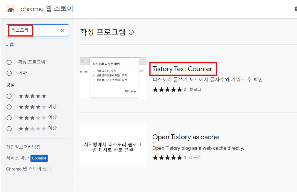 5. Chrome 웹 스토어 페이지가 나오면 검색 창에 '티스토리'를 입력 후 엔터를 누르고 [Tistory Text Counter] 를 찾아 클릭합니다.