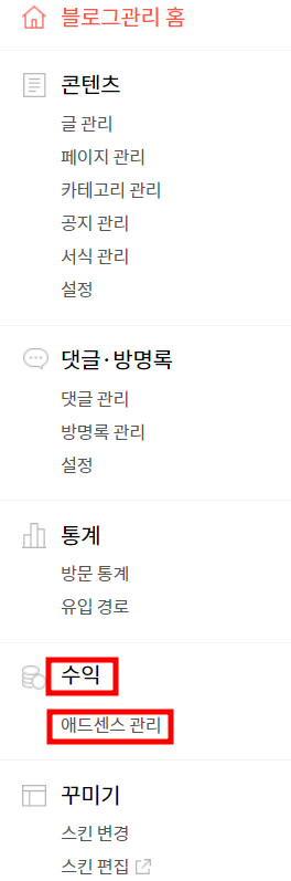 티스토리 블로그 설정 (화면 좌측)에서 [수익] ][애드센스 관리]를 선택합니다.